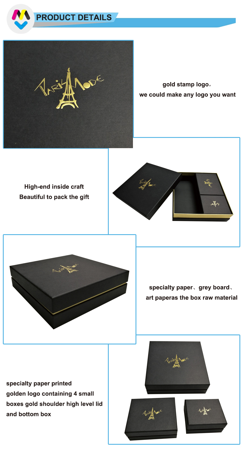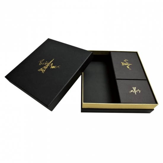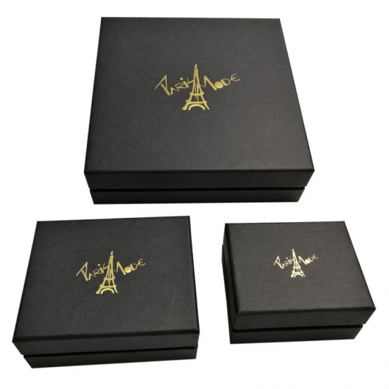 هذه مجموعة واحدة من الصناديق الكبيرة السوداء الفاخرة مع غطاء صندوق صغير وقاعدة صندوق هدايا، كل صندوق مصنوع مصنوعة من ورق أسود خاص + لوح رمادي 1200 جرام والشعار عبارة عن رقاقة ذهبية على الأغطية العلوية.