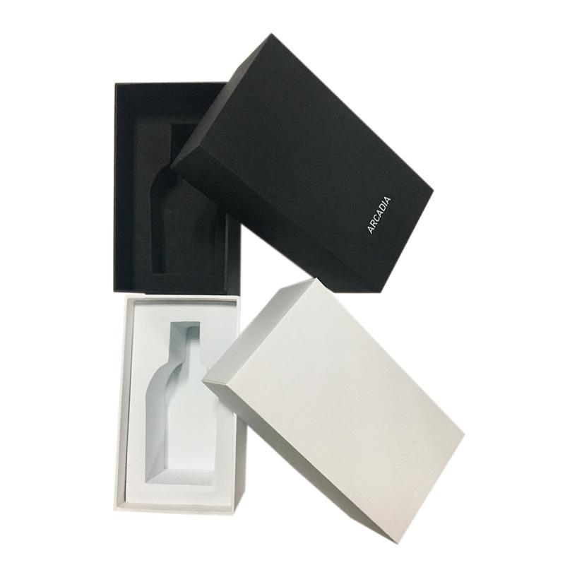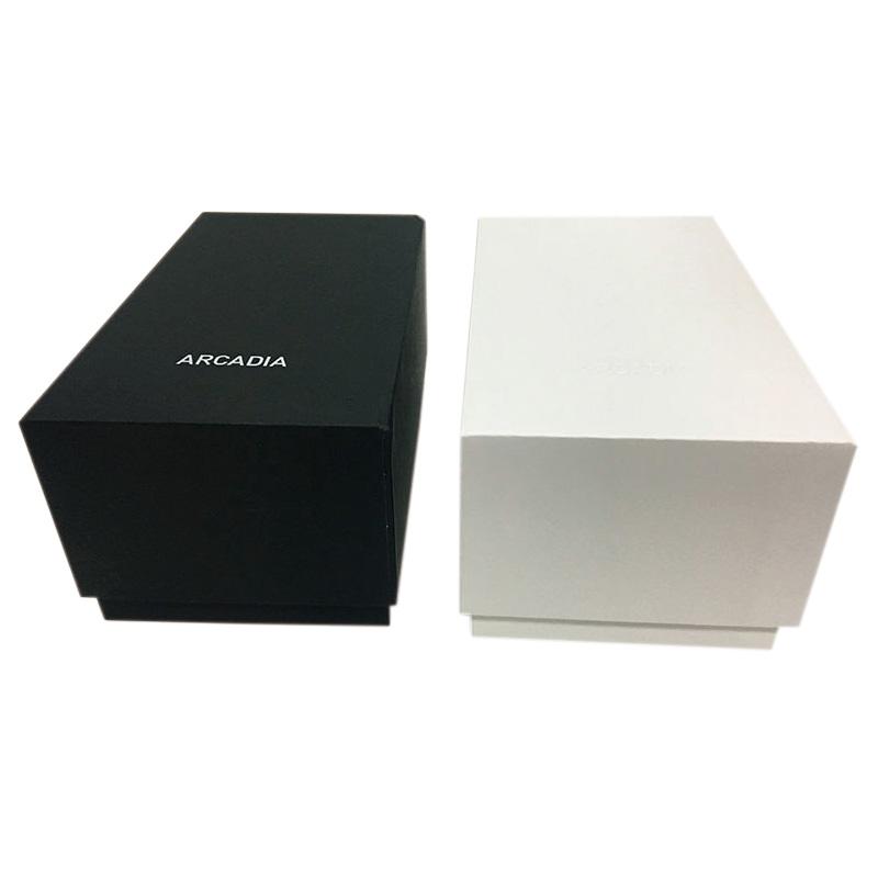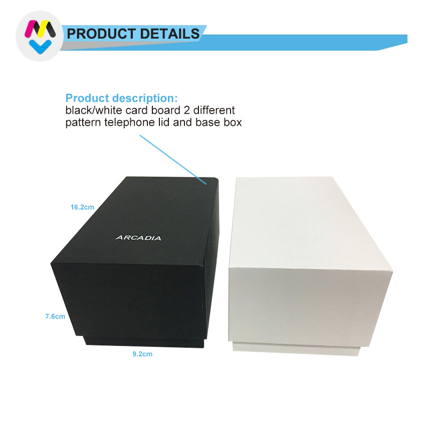 هذا الصندوق متوفر بلونين مختلفين، الأسود والأبيض. هذان النمطان المختلفان لهما نفس الحجم، 9.2 × 16.2 × 7.6 سم. مزود ببطانة من مادة إيثيلين فينيل أسيتات. مصنوع من ورق فني مطلي بوزن 157 غرامًا للمتر المربع، ولوح رمادي مزدوج الجوانب بسمك 2 مم، وكرتون أسود.