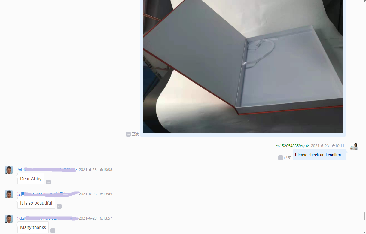 وأخيرًا وافق على فكرتنا. بعد تأكيد تصميم الطباعة معه، اكتملت عينة الصندوق في ثلاثة أيام. أرسلنا لك صورًا وفيديوهات للرجوع إليها. أعجبته كثيرًا.