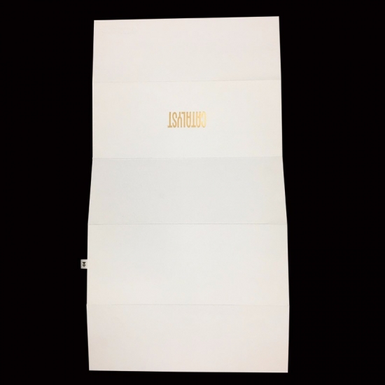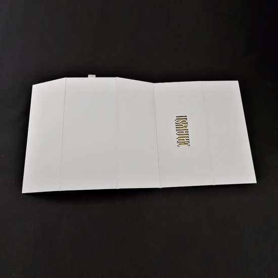 مصنوع من ورق خاص + لوح رمادي 2 مم، بدون طباعة من الخارج، طباعة كاملة بالألوان من الداخل ونقش الشعار، ختم ساخن باللون الذهبي.