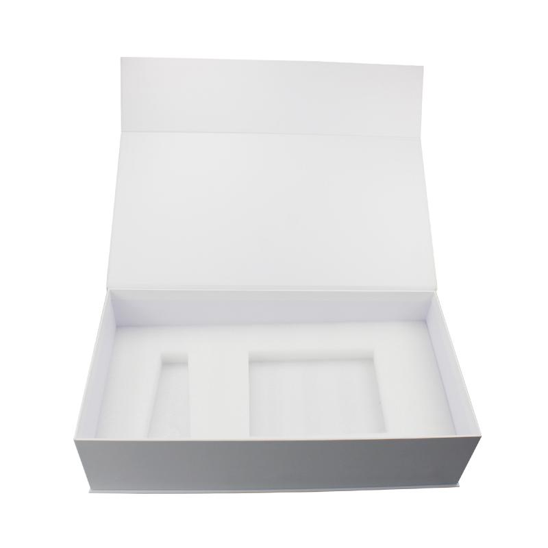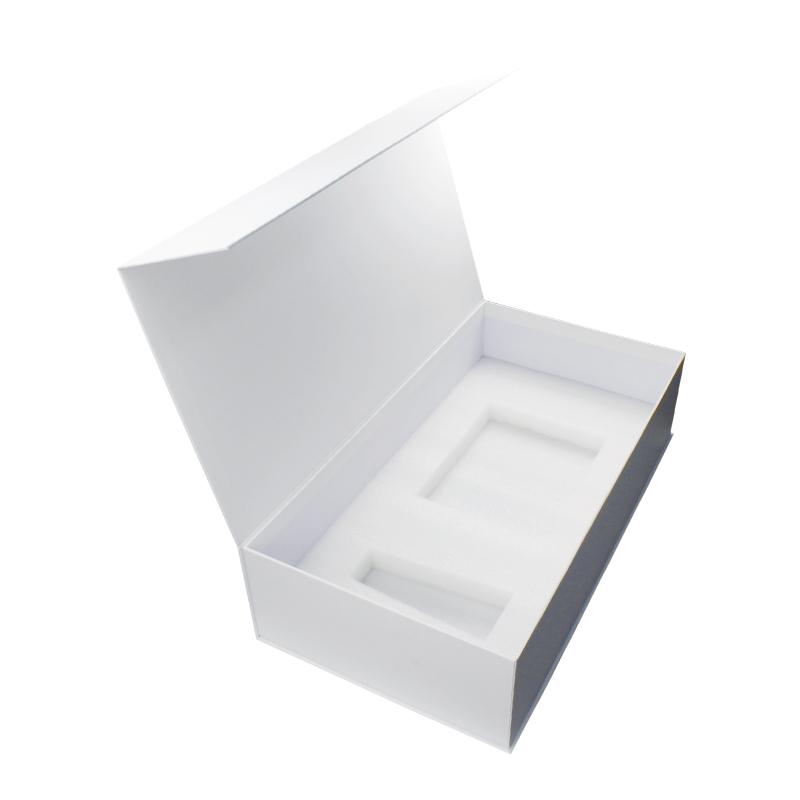 هذا صندوق هدايا صدفي أبيض بسيط وأنيق مخصص مع إغلاق مغناطيسي، مصنوع من ورق فني C2S 157 جرام + لوح رمادي 1200 جرام، ختم الشعار بورق الفضة مع حشوة من رغوة البولي إيثيلين البيضاء.