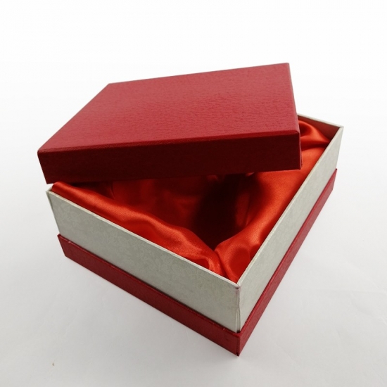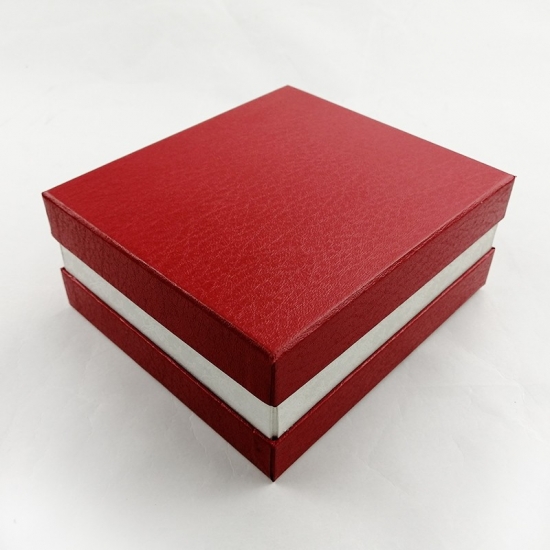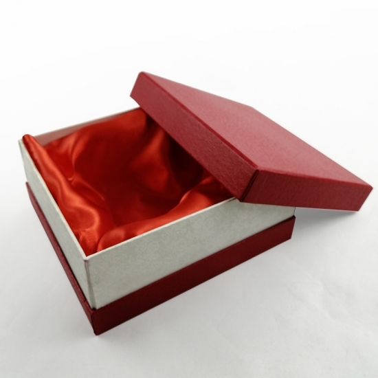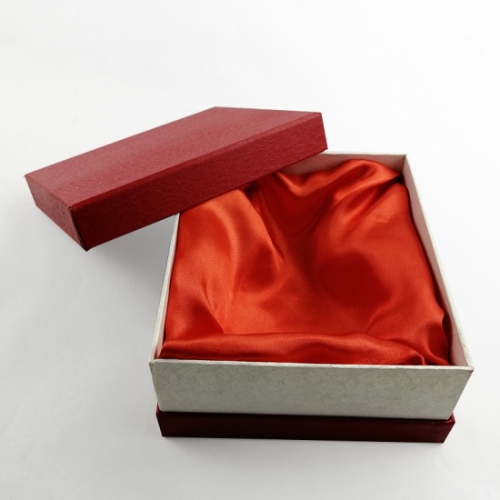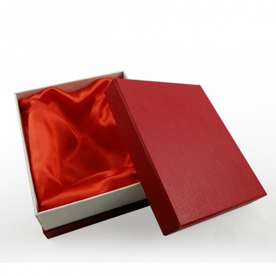 هذا صندوق هدايا أحمر مربع كبير مزخرف ذهبي اللون مع أغطية، مصنوع من ورق بنمط نسيج خاص، مع بطانة من القماش الساتان وحشوة إسفنجية. المقاس: 12 × 12 × 6 بوصات.