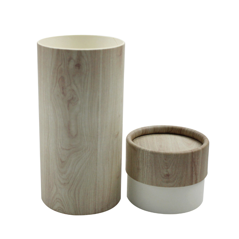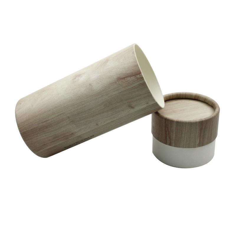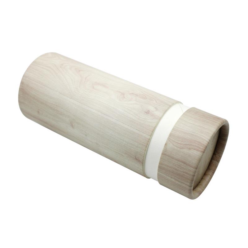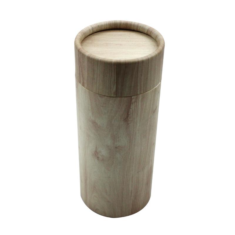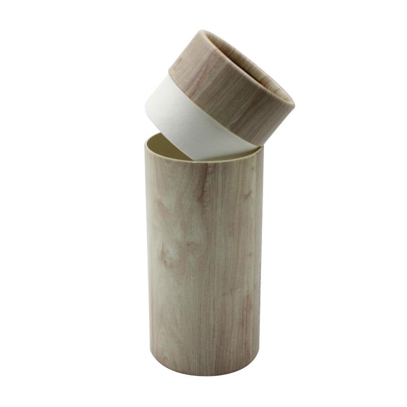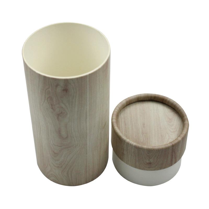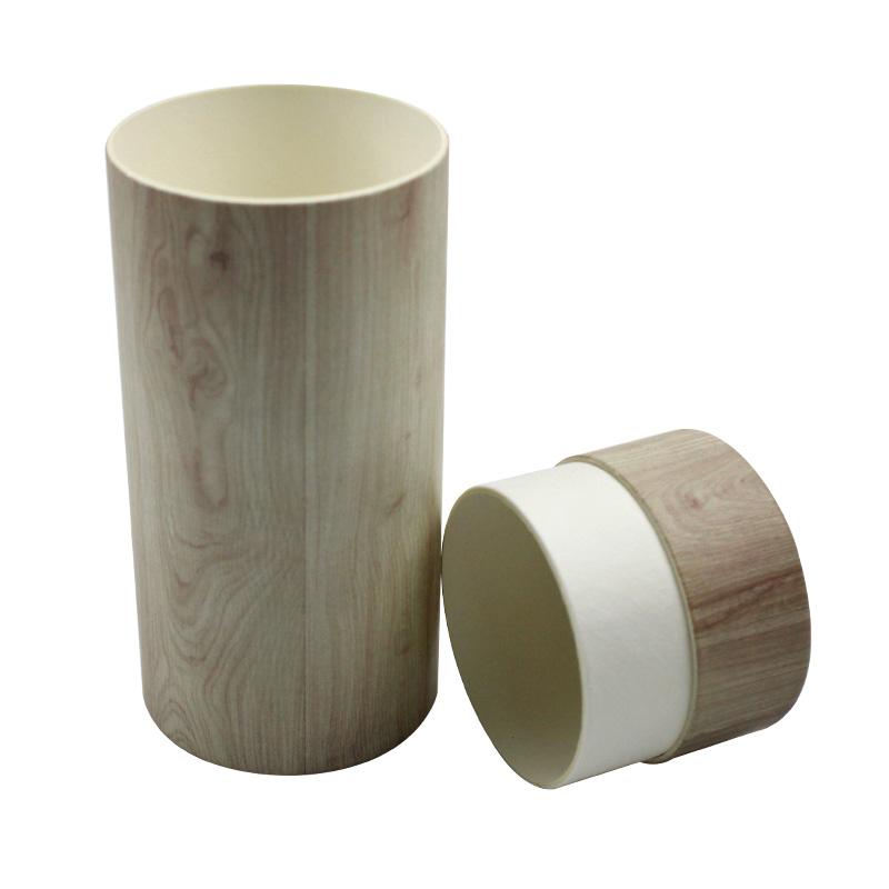 هذه هي صندوق هدايا دائري مع غطاء مصنوع من ورق خاص بحبيبات الخشب. يبدو كعلبة تغليف خشبية فاخرة.