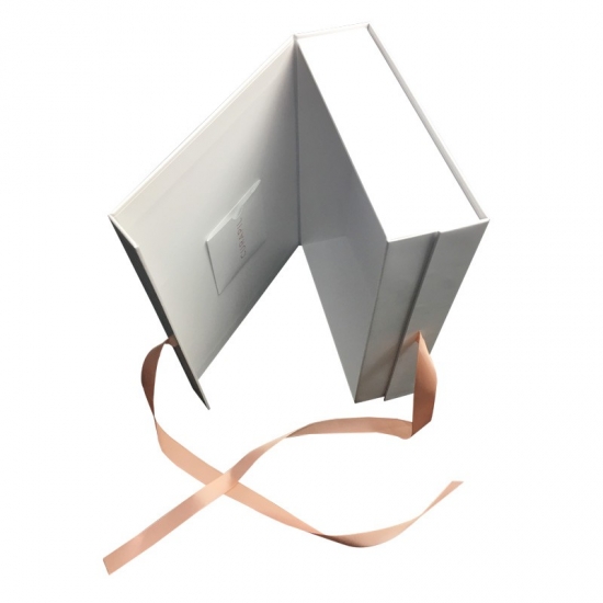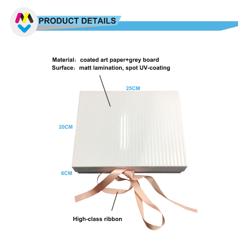 صندوق هدايا مغناطيسي أبيض مع شريط إغلاق مصنوع من ورق فني C2S 157 جرامًا للمتر المربع مغلفًا بورق مقوى رمادي 2 مم مع دعم شريط مخصص لأي حجم وأي لون، وكان التشطيب السطحي عبارة عن تصفيح غير لامع وطلاء موضعي للأشعة فوق البنفسجية