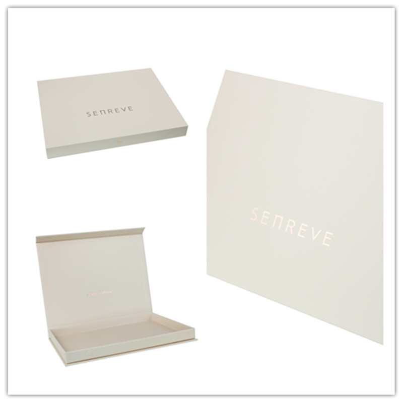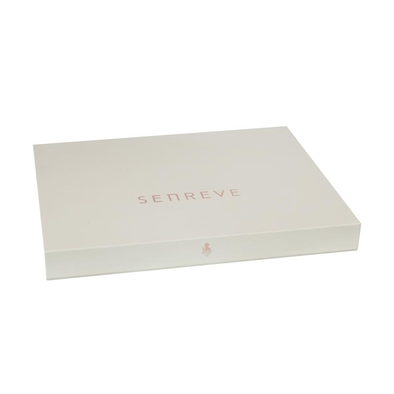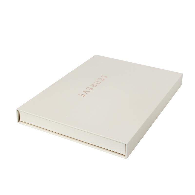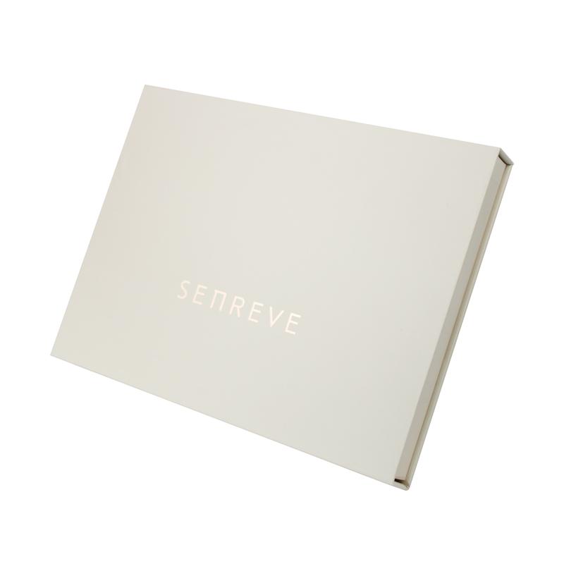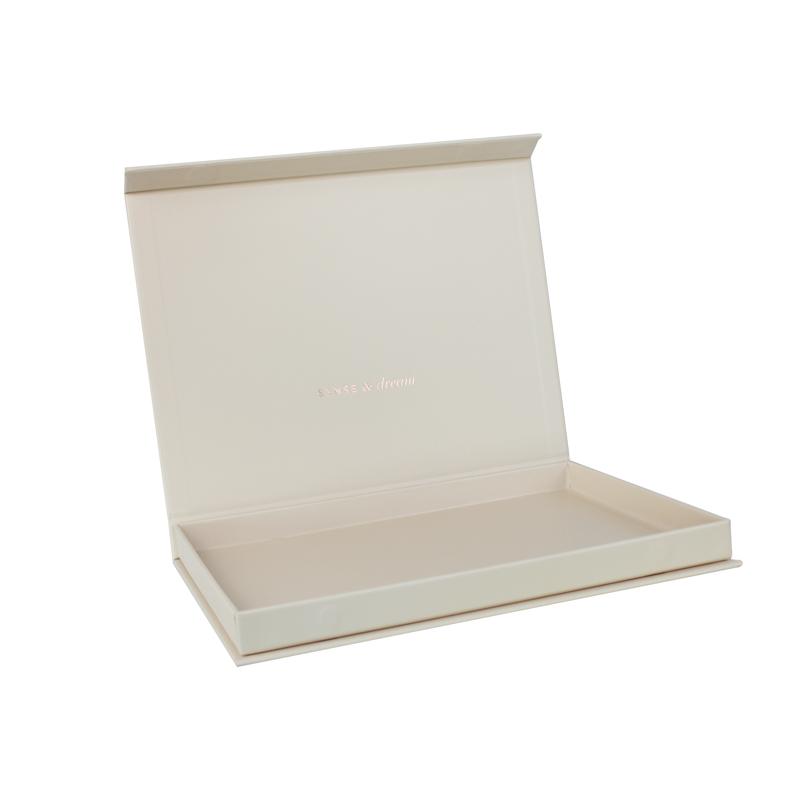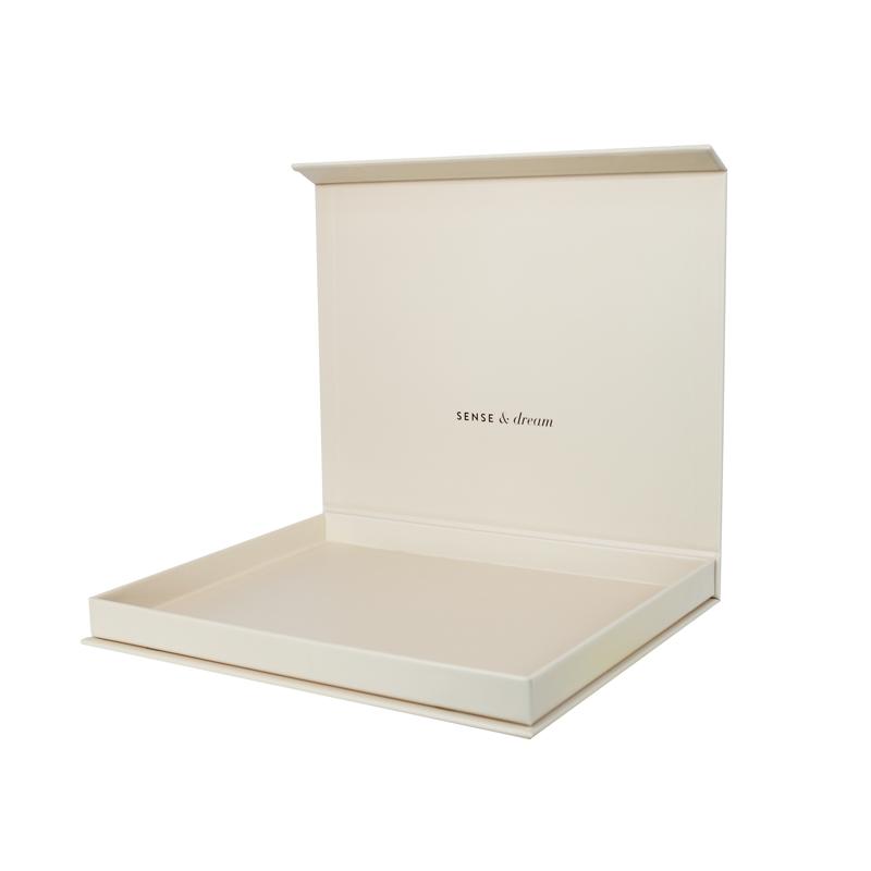 هذا صندوق تغليف هدايا على شكل كتاب مصنوع من ورق فني بوزن 157 غرامًا للمتر المربع، مغلف بورق رمادي فاخر بسمك 2 مم، مع قفل مغناطيسي قوي. الشعار مطبوع بورق ذهبي وردي فاتح. بسيط ولكنه كلاسيكي.