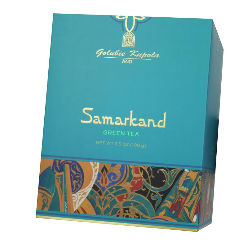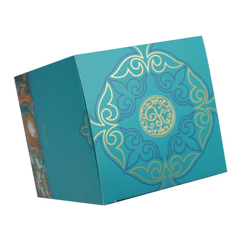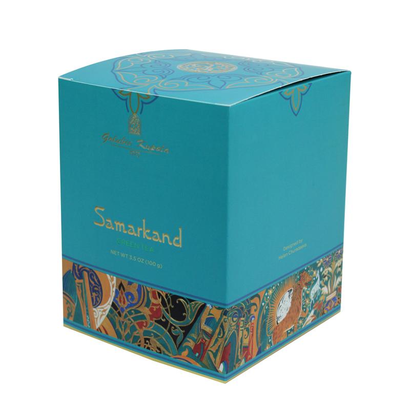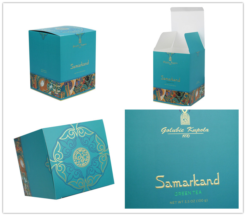 هذا الصندوق مصنوع من ورق مقوى ٣٠٠ غرام/م²، مطبوع عليه تصميم ملون بالكامل. اسم العلامة التجارية منقوش بورق ذهبي، واسم الشاي باللون الأخضر. جميع أنواع ورق التغليف الملون متوفرة لإضفاء لمسة مميزة على هوية العلامة التجارية.
