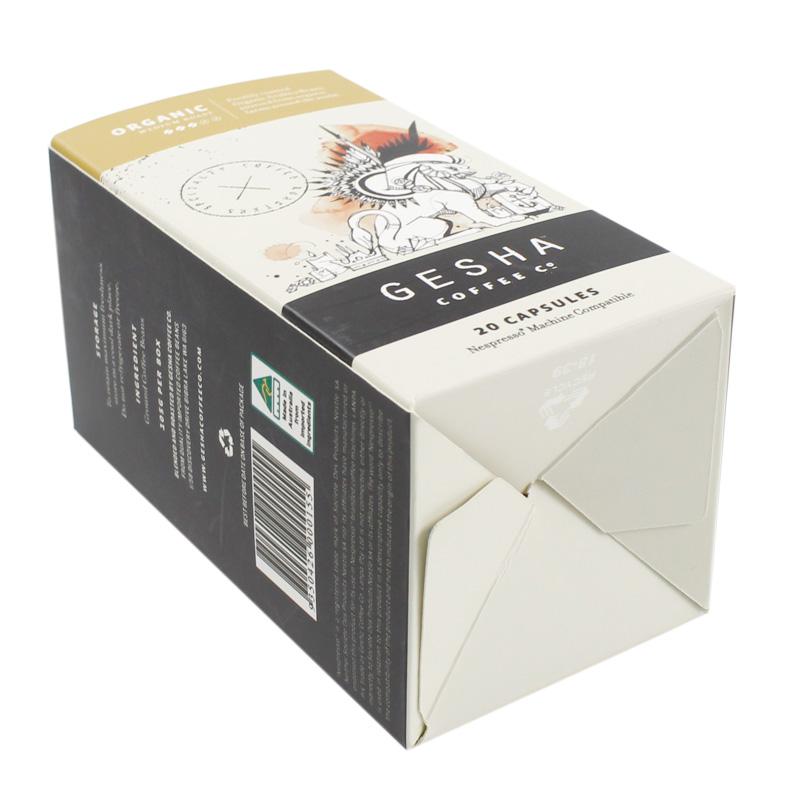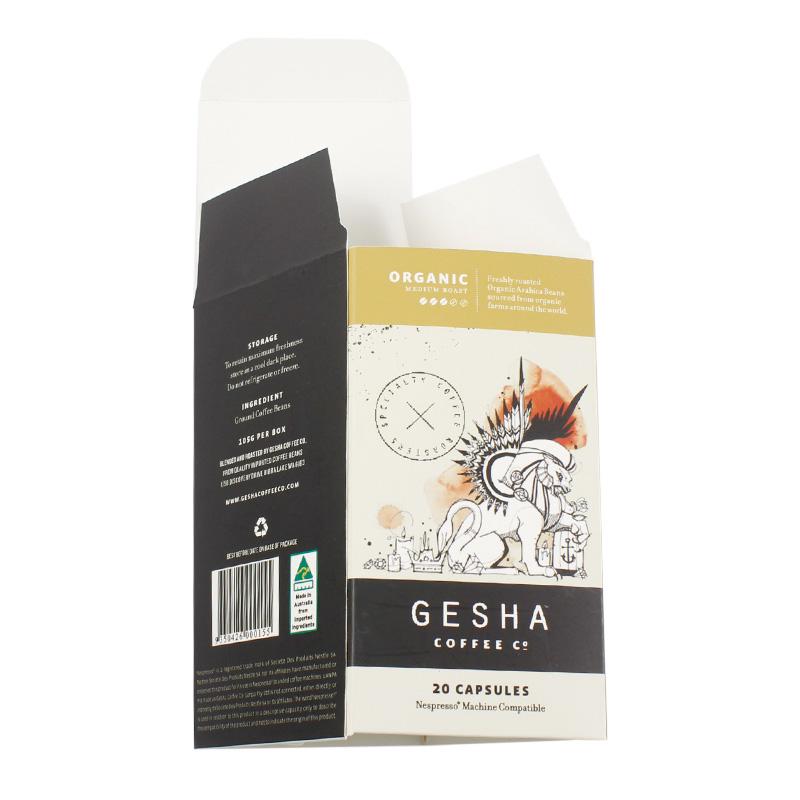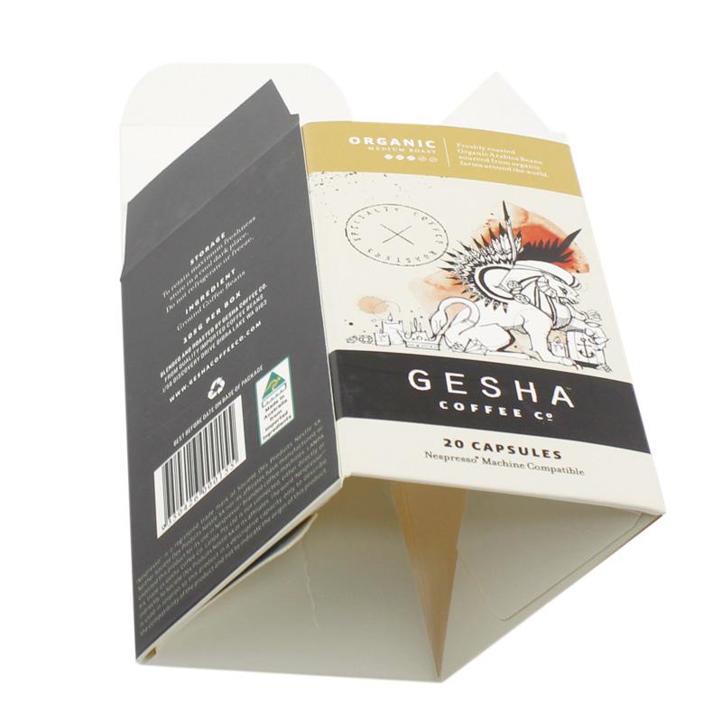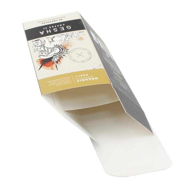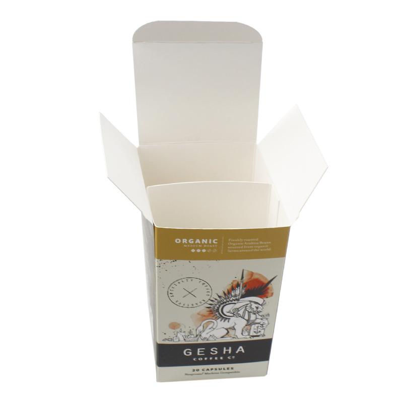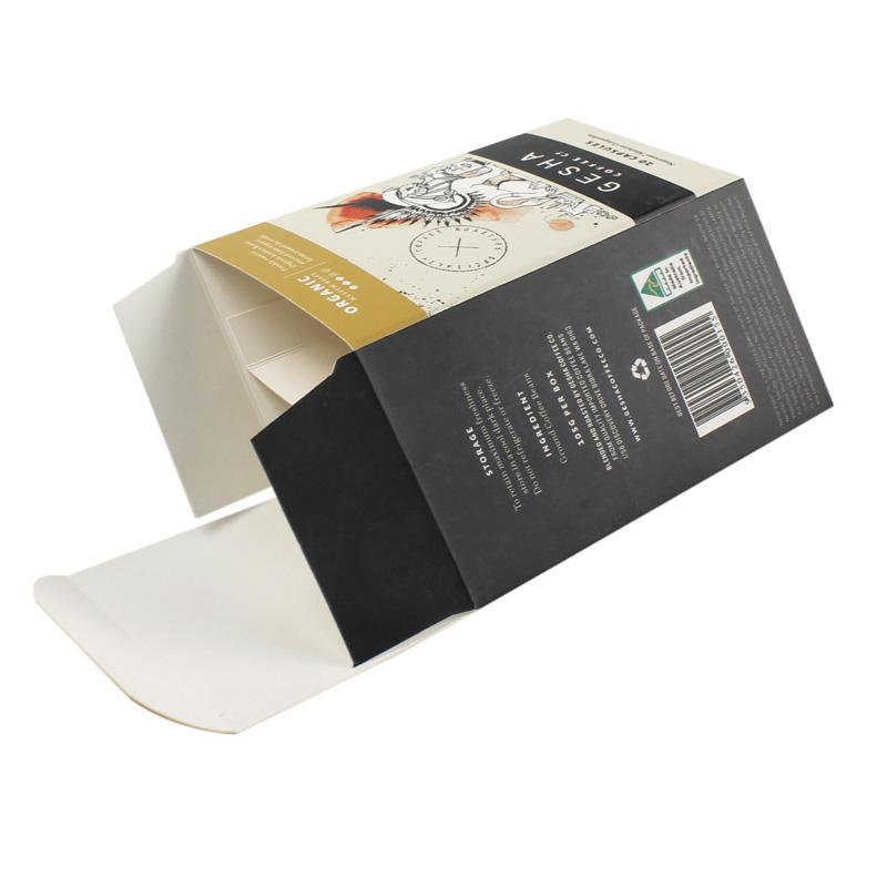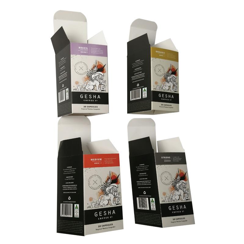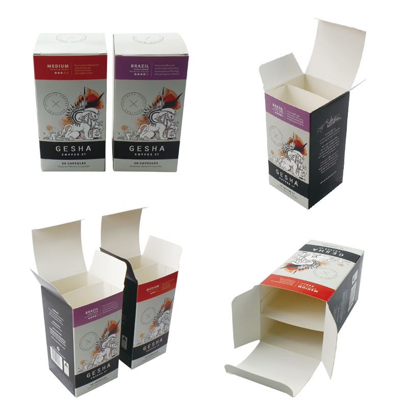 هذا الصندوق ذو القاعدة الأوتوماتيكية مصنوع من كرتون أبيض 350 غ/م2، مطبوع بألوان CMYK4C وPantone Grey، مع طلاء مطفي. يُستخدم لتغليف قهوة الضغط. لكل هدية تصميم طباعة مختلف. يُستخدم هذا النوع من الصناديق الكرتونية الناعمة عادةً لتغليف المنتجات الصغيرة، مثل الأدوية وزجاجات التجميل، إلخ.