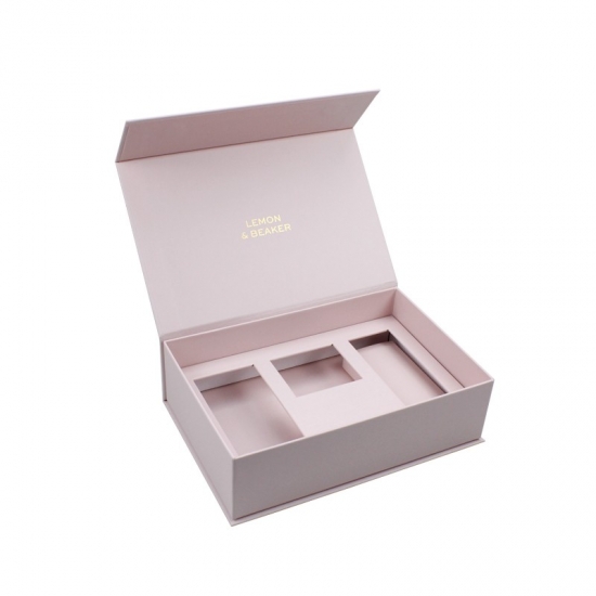 صندوق هدايا مغناطيسي وردي مزخرف مصنوع من ورق فني C2S 157 جرامًا للمتر المربع مغلف بدرج داخلي من الورق المقوى الرمادي 2 مم، وهو عبارة عن درج ورق، وتصفيح غير لامع، وختم ساخن باللون الوردي