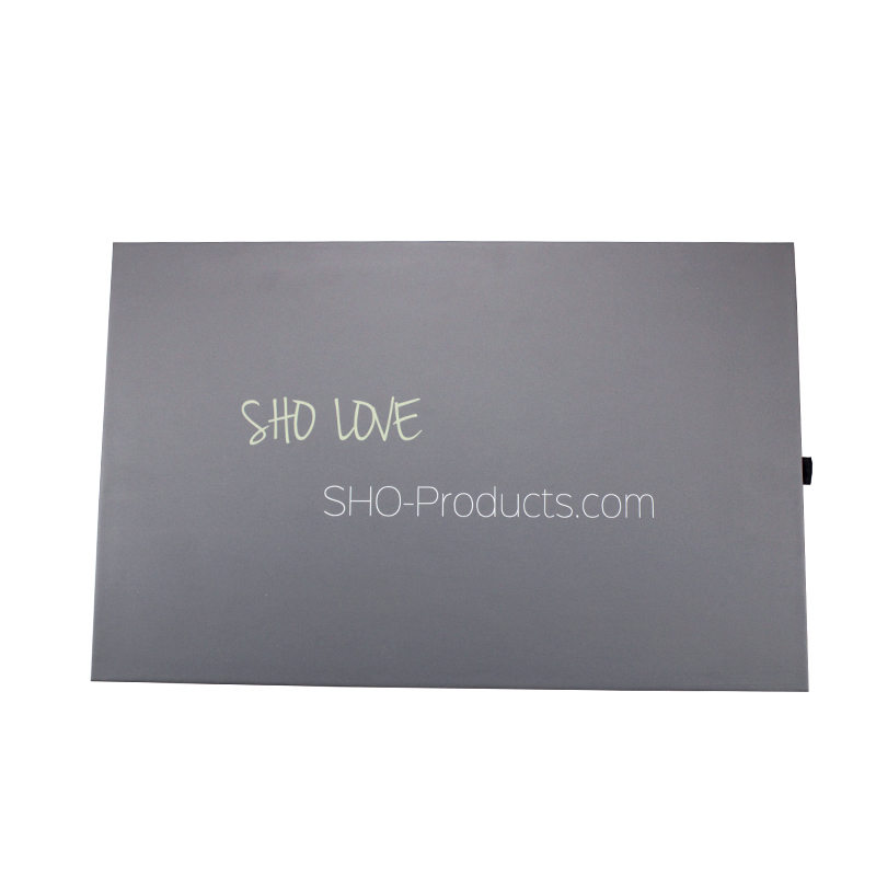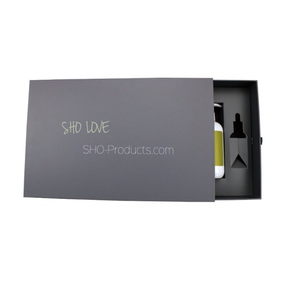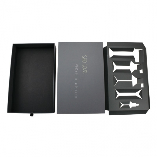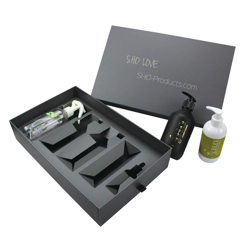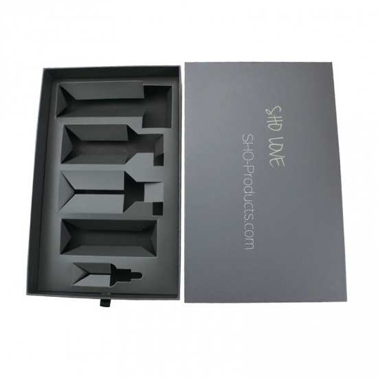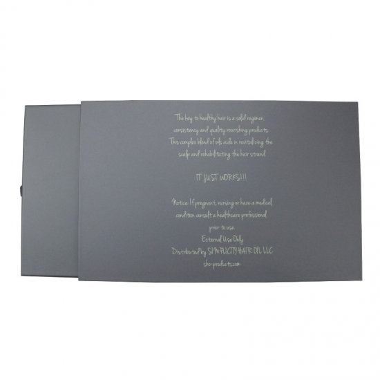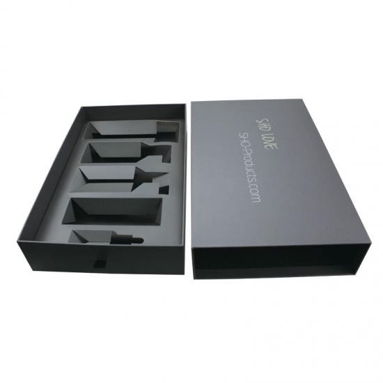 إنها درج هدايا منزلق صندوق مع ساحب الشريط الذي جعل باستخدام ورق فني C2S بوزن 157 جرامًا + لوح رمادي بوزن 1200 جرامًا ، يوجد داخل الصندوق فواصل استخدم لونًا رماديًا عاديًا كرتون يتم تقطيعه وتشكيله حسب شكل المنتج.