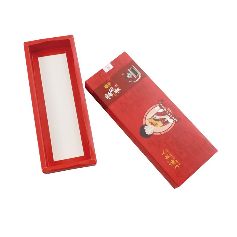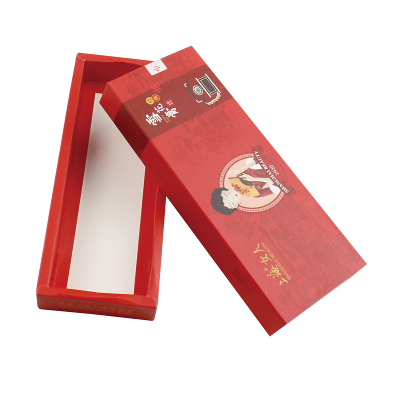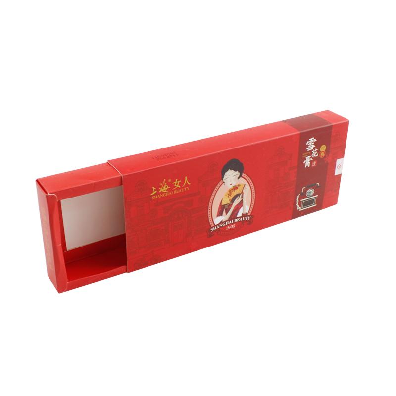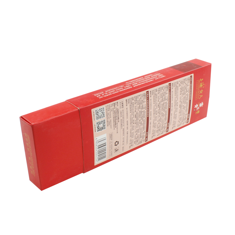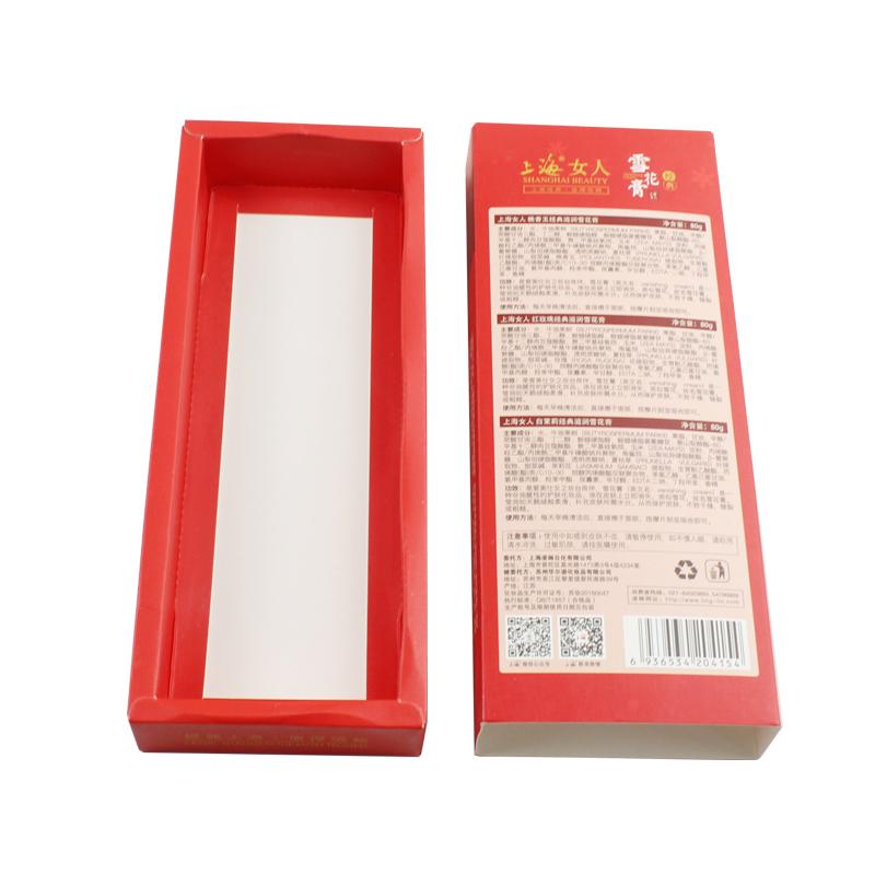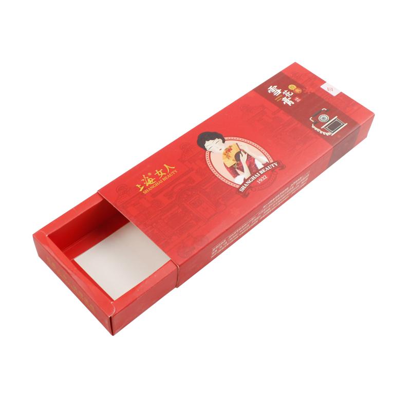 هذه هي صندوق أدراج مسطح الذي جعل باستخدام ورق فني مطلي من جانب واحد بوزن 350 جرام ، مليئة بالطباعة باللون الأحمر غير اللامع على الصندوق بأكمله مع الشعار والنص.