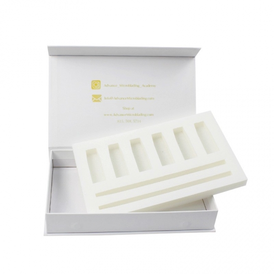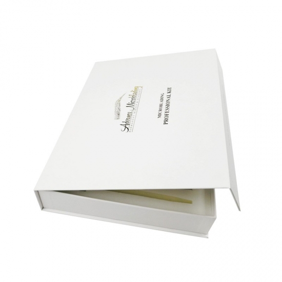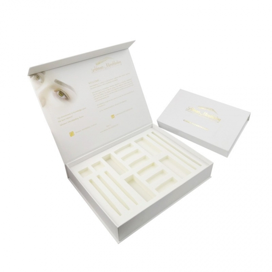 تم تصنيع صندوق التقليب المغناطيسي مع صندوق الختم الساخن من ورق فني C2S 157gsm مغلف بورق رمادي من الورق المقوى 2 مم من الداخل وهو عبارة عن رغوة إسفنجية مخصصة لأي حجم وأي لون وشعار، وكان التشطيب السطحي عبارة عن تصفيح غير لامع، وختم ذهبي ساخن بحجم 24 * 15.5 * 4 سم