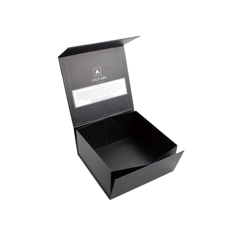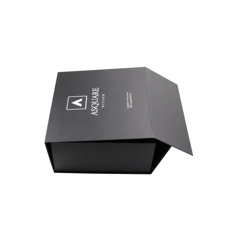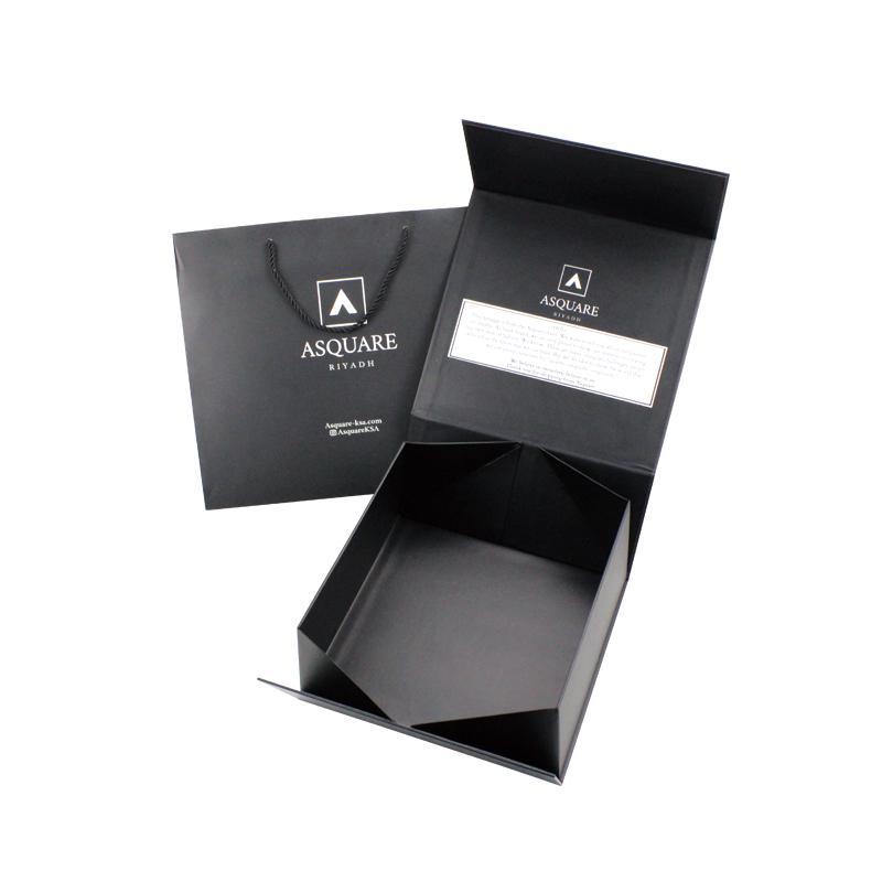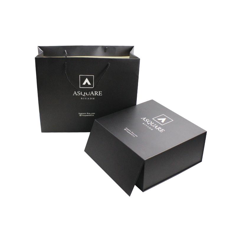 كلاسيكي صناديق قابلة للطي باللون الأسود مصنوعة من ورق فني بوزن 157 جرامًا للمتر المربع، مغلف بلوح خشبي صلب فاخر بسمك 2 مم. تتميز الصناديق بطباعة سوداء بالكامل وطبقة حماية من الخدش. كما يُمكننا طباعة أكياس الهدايا الورقية لتتناسب مع صناديق الهدايا.