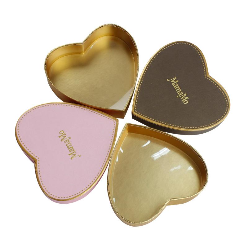 صناديق شوكولاتة على شكل قلب صغيرة الحجم مخصصة مع غطاء، الغطاء مصنوع من ورق مطلي والجزء السفلي يستخدم ورقًا خاصًا.