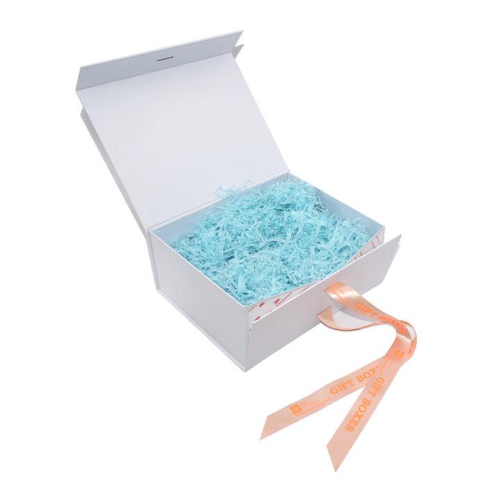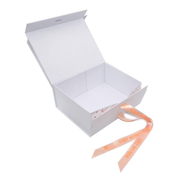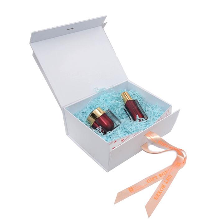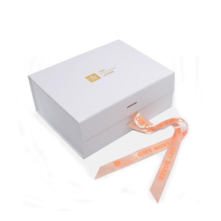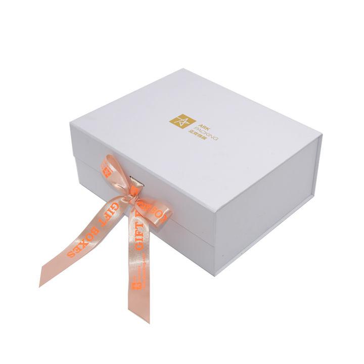 هذا هو اللون الأبيض صندوق هدايا مغناطيسي مع شريط الذي جعل مصنوعة من ورق خاص + لوح رمادي 2 مم، الشعار الخارجي مطبوع بورق ذهبي وردي + منقوش على الجزء العلوي من الغطاء والذي يتناسب مع الشريط باللون الجيد.