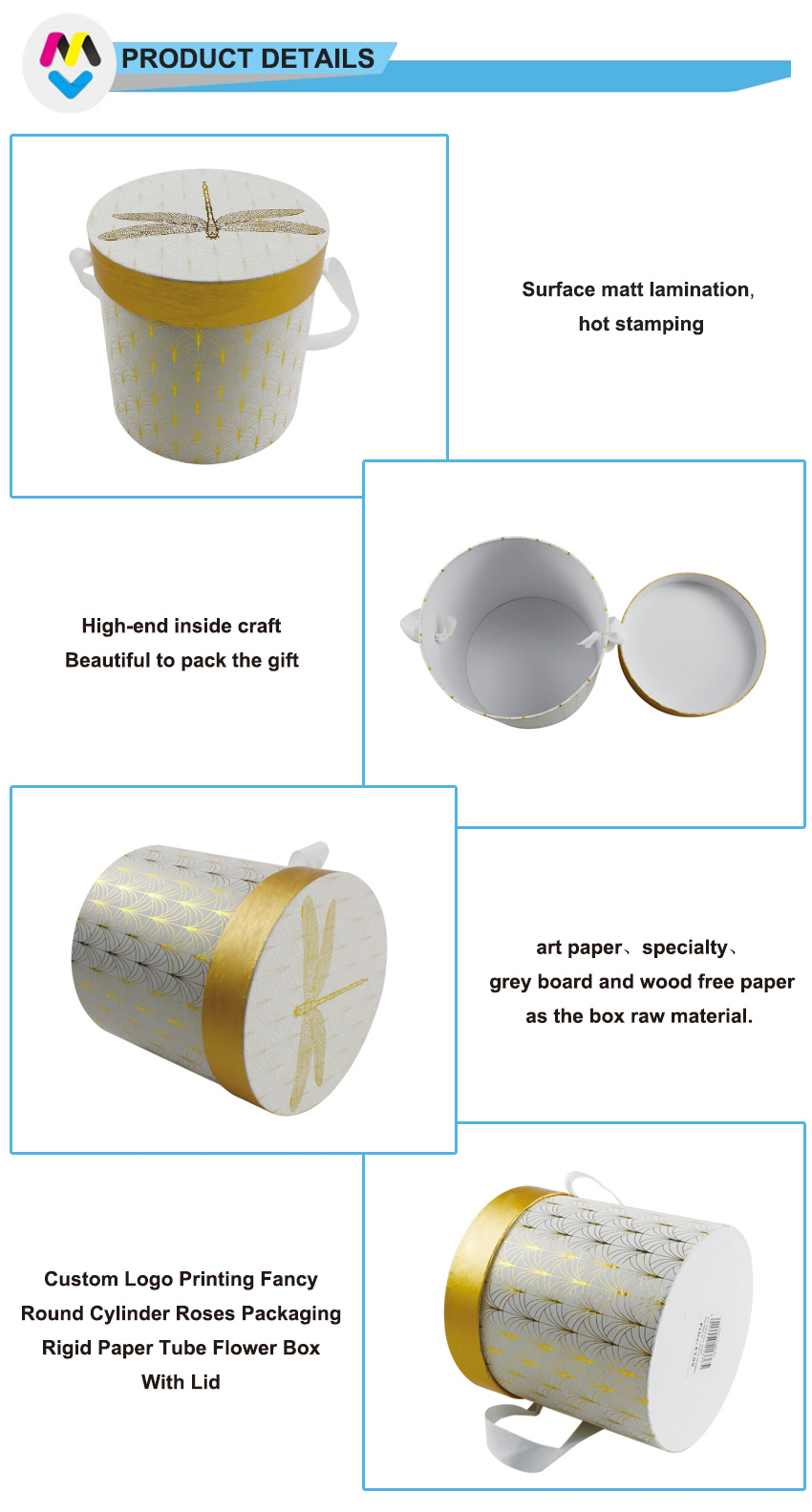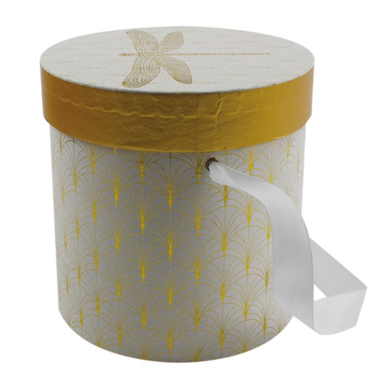 هذا صندوق هدايا دائري كبير مزخرف رائع من الأعلى والأسفل مصنوع من ورق فني C2S 157 جرام + لوح رمادي 1200 جرام، شعار اليعسوب موجود على الغطاء لجعل الصندوق يبدو حقيقيًا ومقبض شريطي يسهل إزالته.