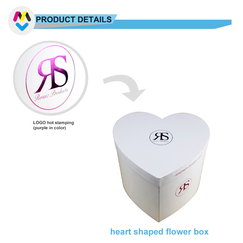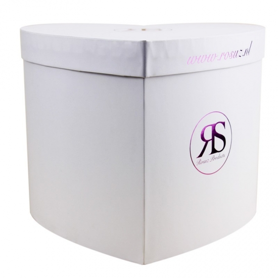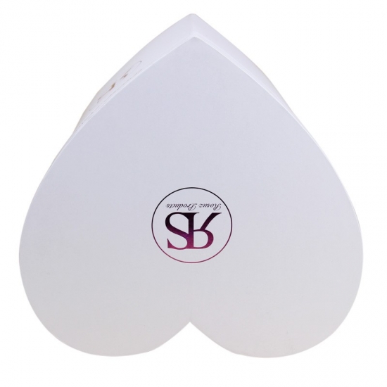 هذا هو غطاء وقاعدة صندوق هدايا على شكل قلب كبير مخصص مع زهرة بيضاء عادية مصنوع من ورق فني C2S بوزن 157 جرام + لوح رمادي بوزن 1200 جرام استخدم ختم رقائق الذهب الأرجواني للشعار الموجود في الجزء العلوي من الغطاء.