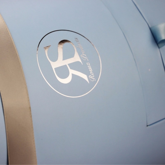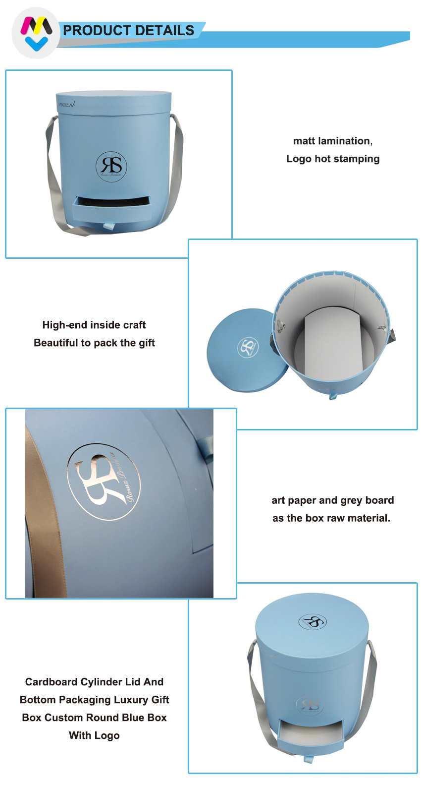 شعار أزرق فاتح مخصص ختم رقائق الفضة صناديق ورقية دائرية مع غطاء ودرج صغير، ومقبض حمل.