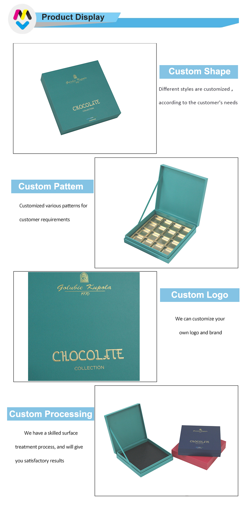 نحن ندرك أن العرض هو جانب ضخم يحدد الانطباع الأول عن حلوى الشوكولاتة الخاصة بك، مما يعني أن صناديق هدايا الشوكولاتة ذات العلامة التجارية الفاخرة ستعزز براعم التذوق لدى عملائك وتجربة التذوق
