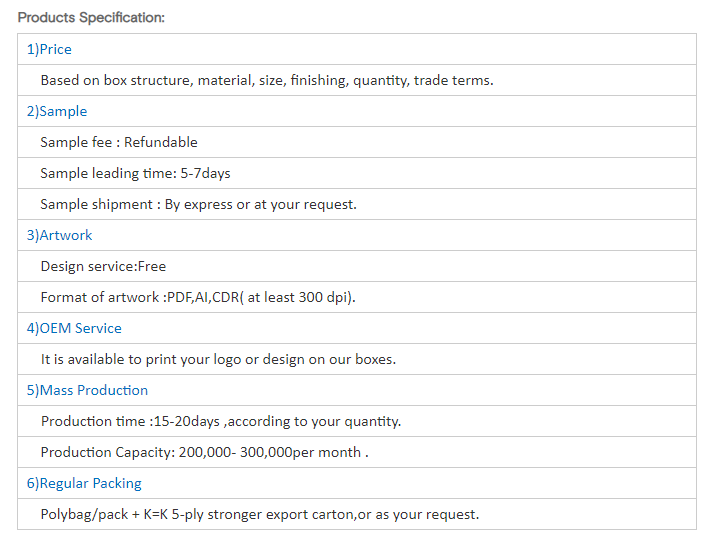 يرجى العلم أن جميع صور المنتجات المنشورة على موقعنا الإلكتروني هي مجرد معلومات عن نوع التغليف الذي يمكننا تصنيعه، ولا تعني أننا نبيع نفس المنتج كما هو. يمكننا تصميم أي حجم أو لون أو تصميم لتغليف الورق حسب الطلب.