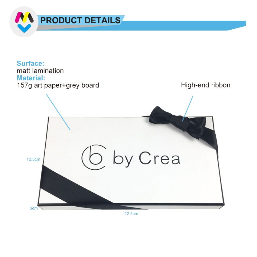 إنه صندوق هدايا قصير مزخرف بعقدة شريطية سوداء صغيرة رومانسية عالية الجودة مخصصة مصنوع من ورق فني C2S + لوح رمادي 1000 جرام، استخدم شعار الطباعة لجعل الصندوق بسيطًا وأنيقًا.