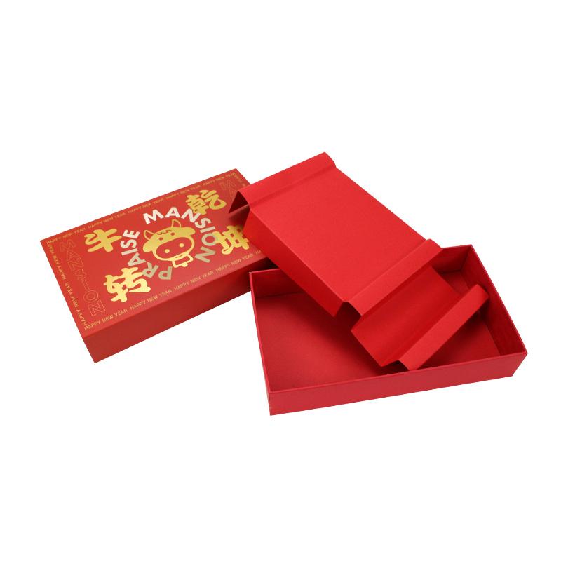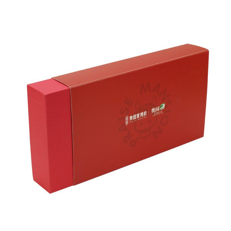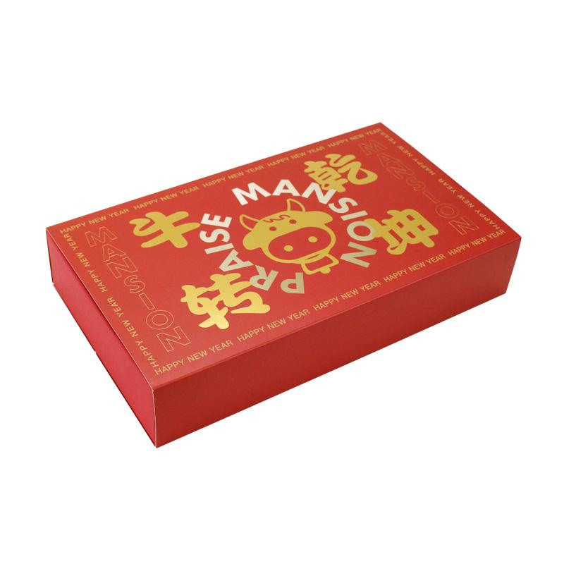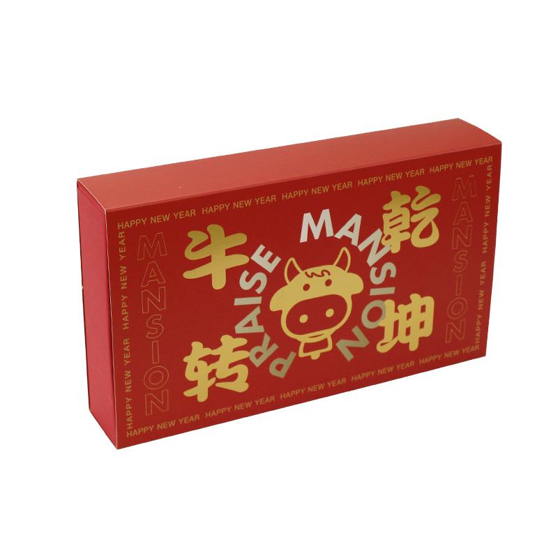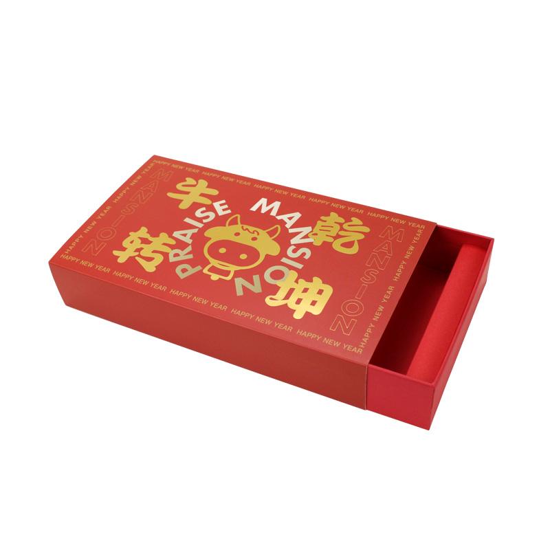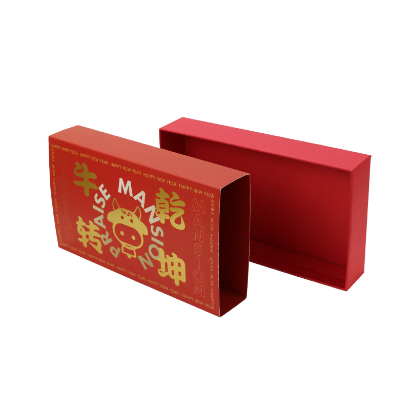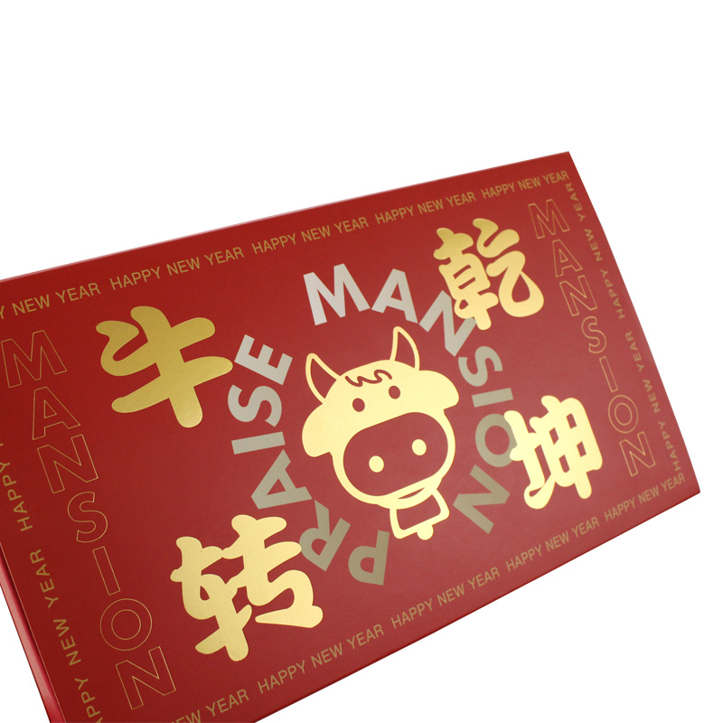إنها صندوق درج قابل للطي الذي جعل باستخدام ورق فني مطلي من جانب واحد بوزن 350 جرام ، مليئة بالطباعة باللون الأحمر على الصندوق بأكمله مع الشعار والنص في ختم رقائق الذهب.