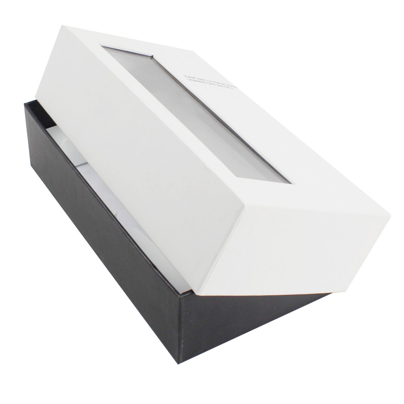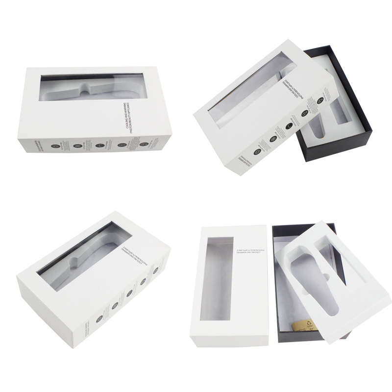 هذه هي الغطاء والقاعدة صندوق الذي جعل باستخدام ورق فني C2S 157 جرام + لوح رمادي 1200 جرام، غطاء متصل بنافذة PVC شفافة لإظهار المنتجات بالداخل، يحتوي الجزء الداخلي من الصندوق على حشوة EVA بيضاء مصممة خصيصًا.