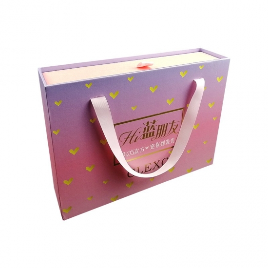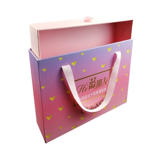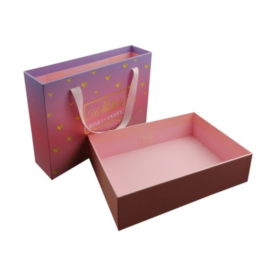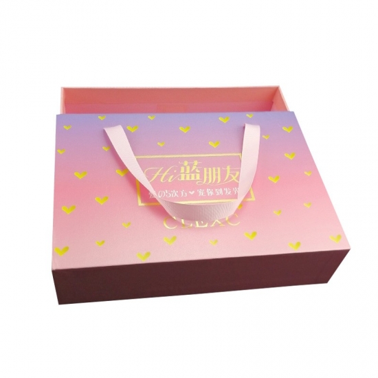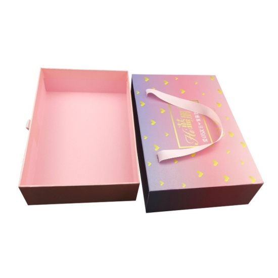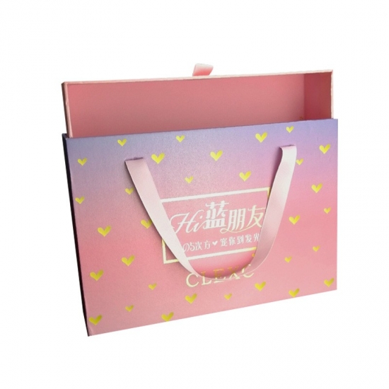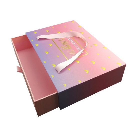 إنه صندوق هدايا رومانسي كبير الحجم باللون الوردي مع درج منزلق ومقبض من الشريط الذي جعل باستخدام ورق فني C2S بوزن 157 جرامًا + لوح رمادي بوزن 1200 جرامًا ، طباعة نمط رسومي كامل على الجزء الخارجي من الصندوق، وقاعدة الصندوق مطبوعة باللون الوردي العادي مع لمسة نهائية غير لامعة.