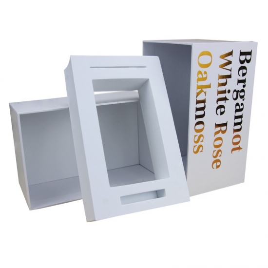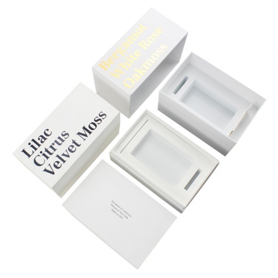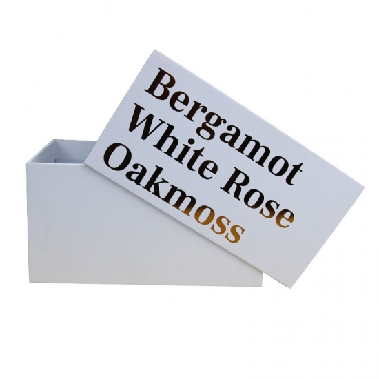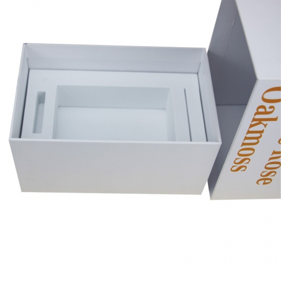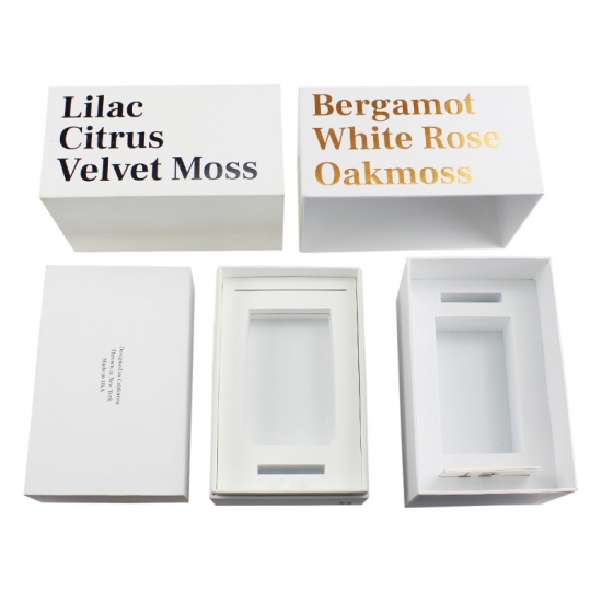 هذه هي صندوق شموع أبيض مع غطاء الذي جعل باستخدام ورق فني C2S 157 جرام + لوح رمادي 1200 جرام، نص كامل على جانب واحد مع ختم رقائق ذهبية، يمكن تشكيل رغوة EVA المخصصة وفقًا لذلك.