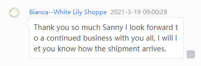 بعد أسبوع واحد من إرسالنا للعينات، بيانكا استلمت العينات وكانت راضية عن جودتها ولونها، فطلبت مباشرةً ٢٠٠٠ مجموعة كطلب تجريبي. الآن، تم تجهيز البضائع وإرسالها. وأعربت عن ارتياحها الشديد لأنها شعرت بارتياح كبير، وقالت إنها ستنقل جميع الطلبات إلى مصنعنا مستقبلًا.