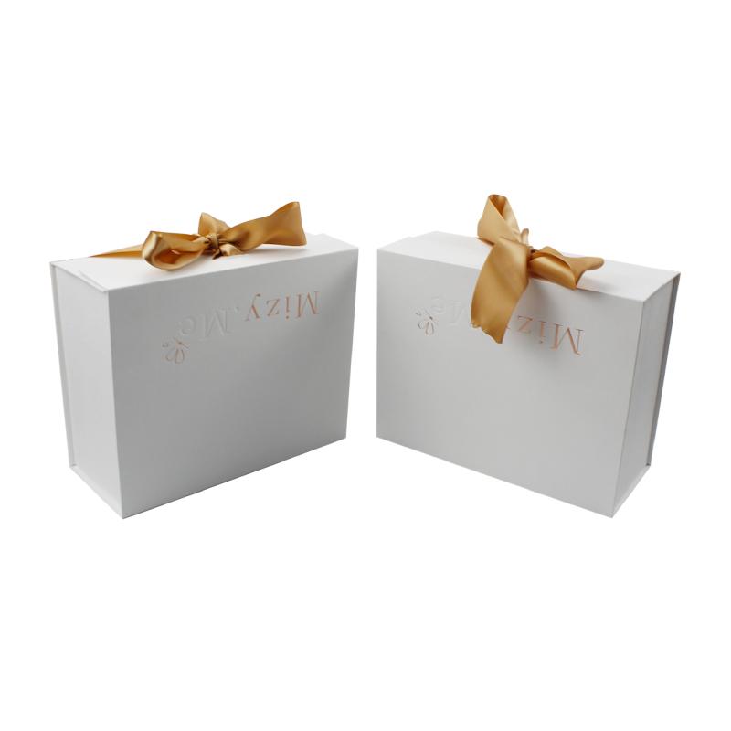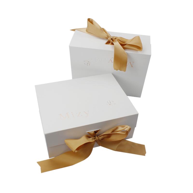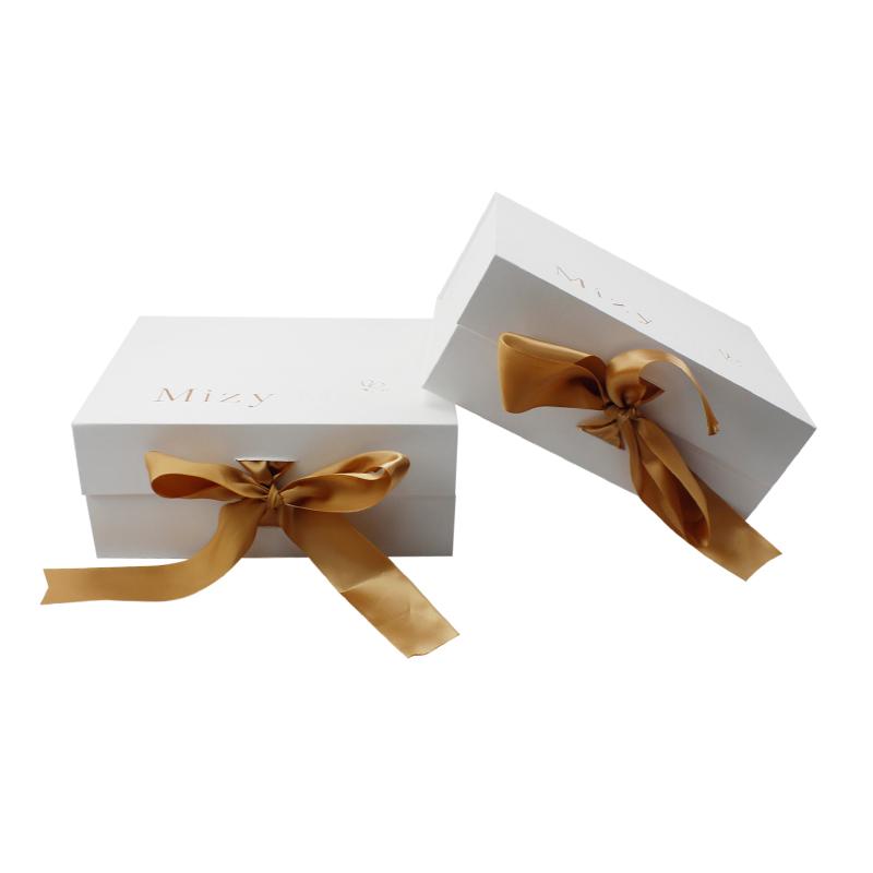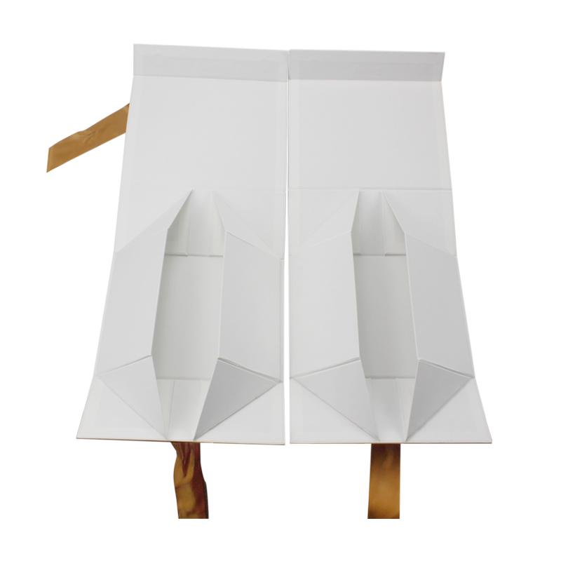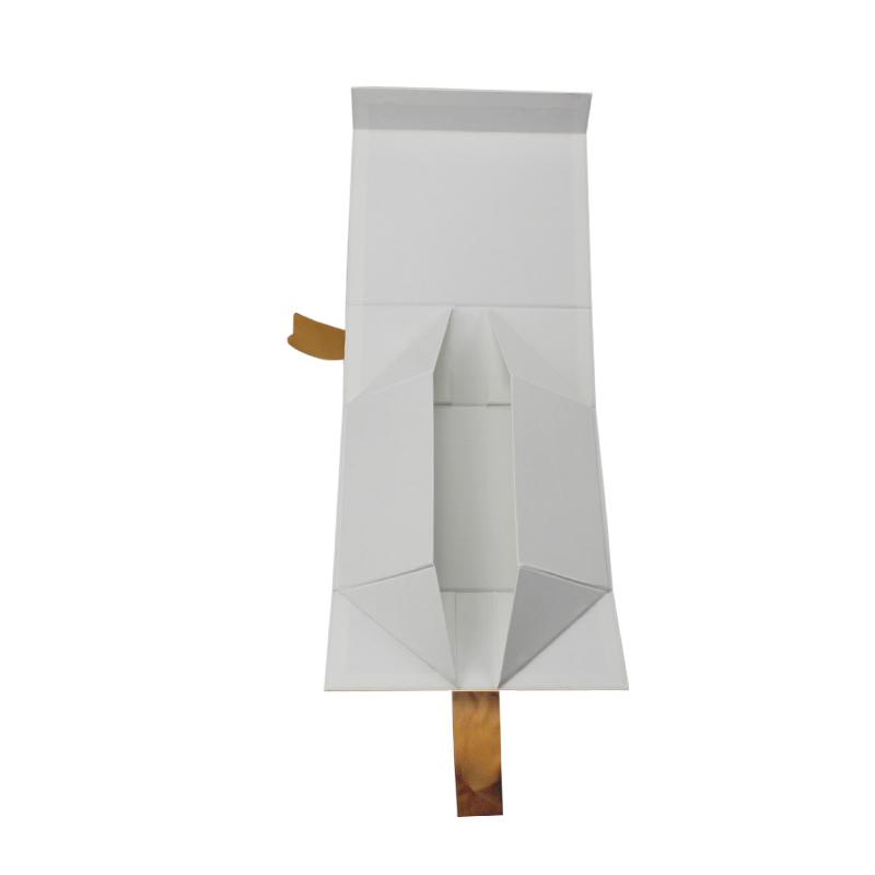 هذا هو اللون الأبيض صندوق أبيض قابل للطي مع شريط الذي جعل باستخدام ورق أبيض خاص + لوح رمادي 2 مم، يتم ختم الشعار الموجود على الجزء الخارجي من الغطاء بورق ذهبي ونقش بارز يتناسب مع الشريط باللون الذهبي، والداخل أبيض فارغ.