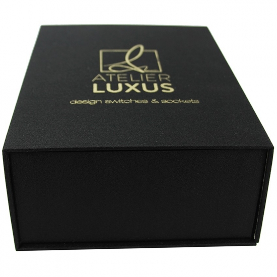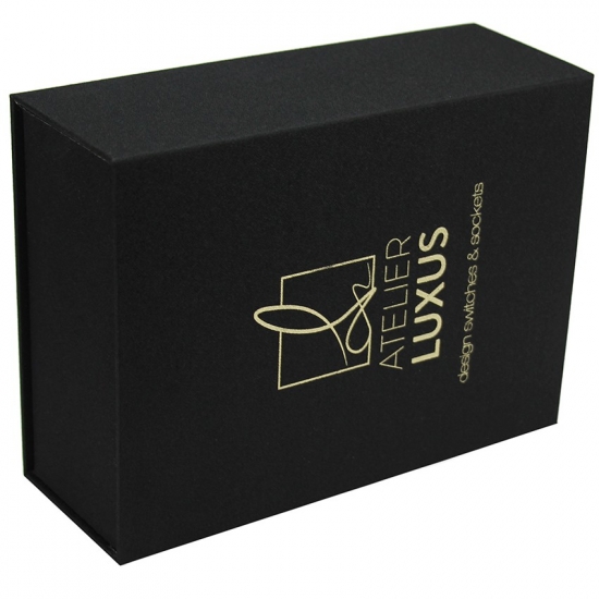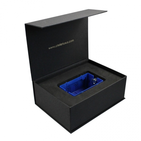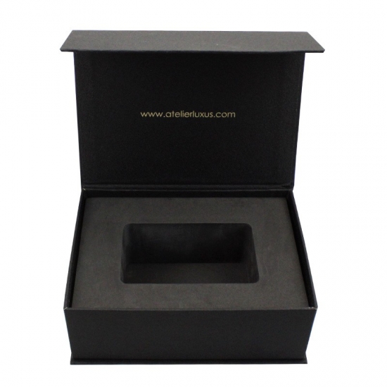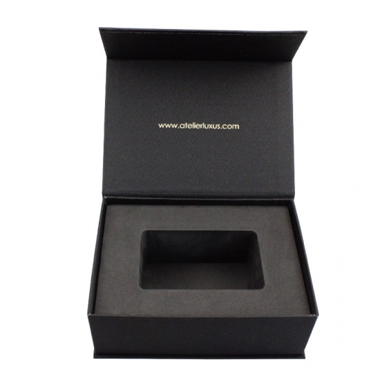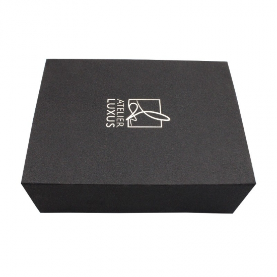 تم صنع صندوق الهدايا الأسود من ورق فني C2S 157gsm مغلف بورق مقوى رمادي 2 مم مع دعم إسفنجي EVA مخصص لأي حجم وأي لون وشعار، وكان التشطيب السطحي عبارة عن تغليف غير لامع وختم ساخن بحجم 21 * 15.5 * 7.5 سم