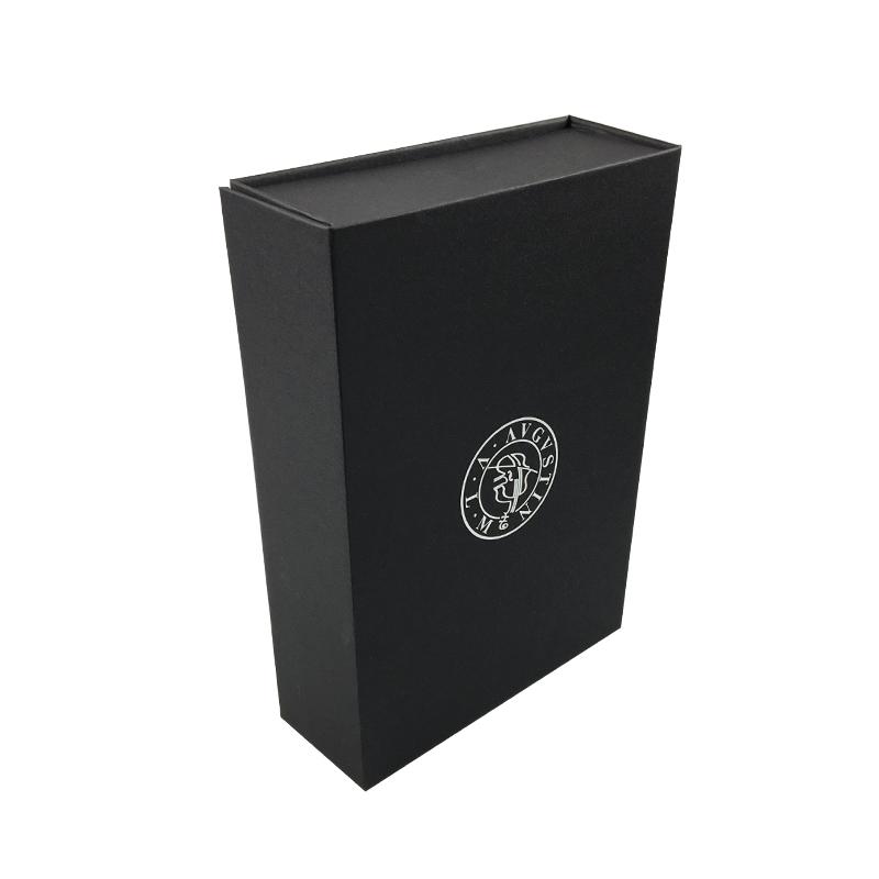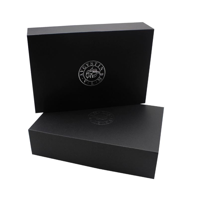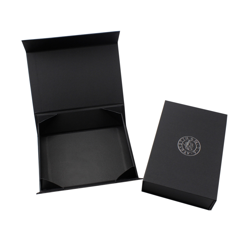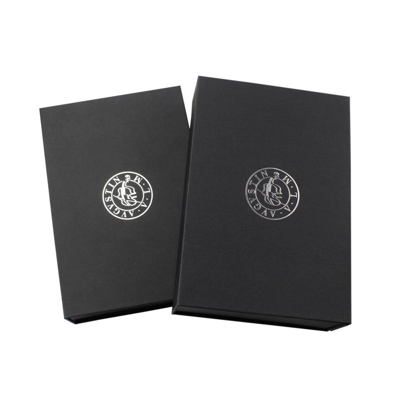 هذا هو اللون الأسود الكلاسيكي الفاخر صناديق هدايا مسطحة بالجملة صندوق هدايا قابل للطي مع شعار مطبوع بورق فضي، مناسب للتغليف لمنتجات التجميل