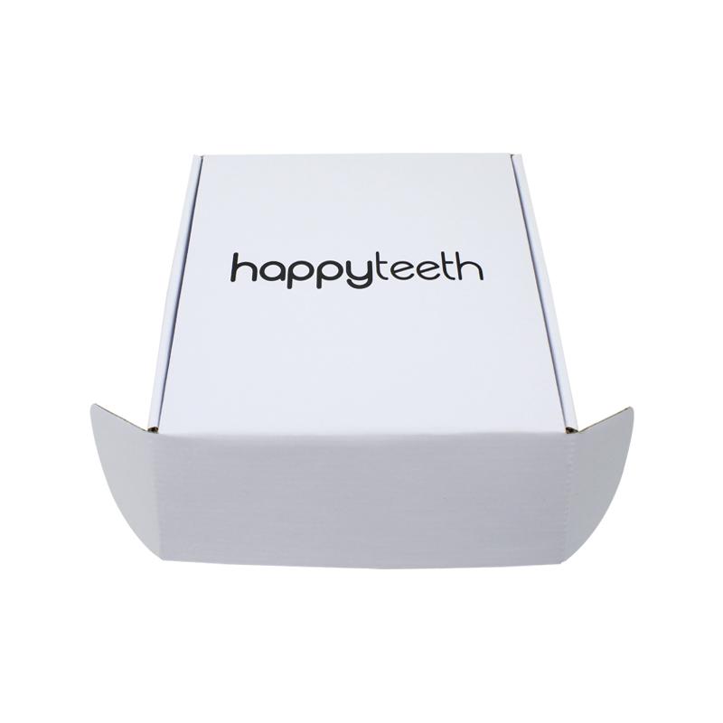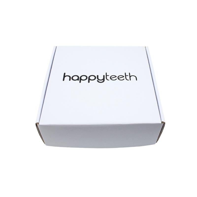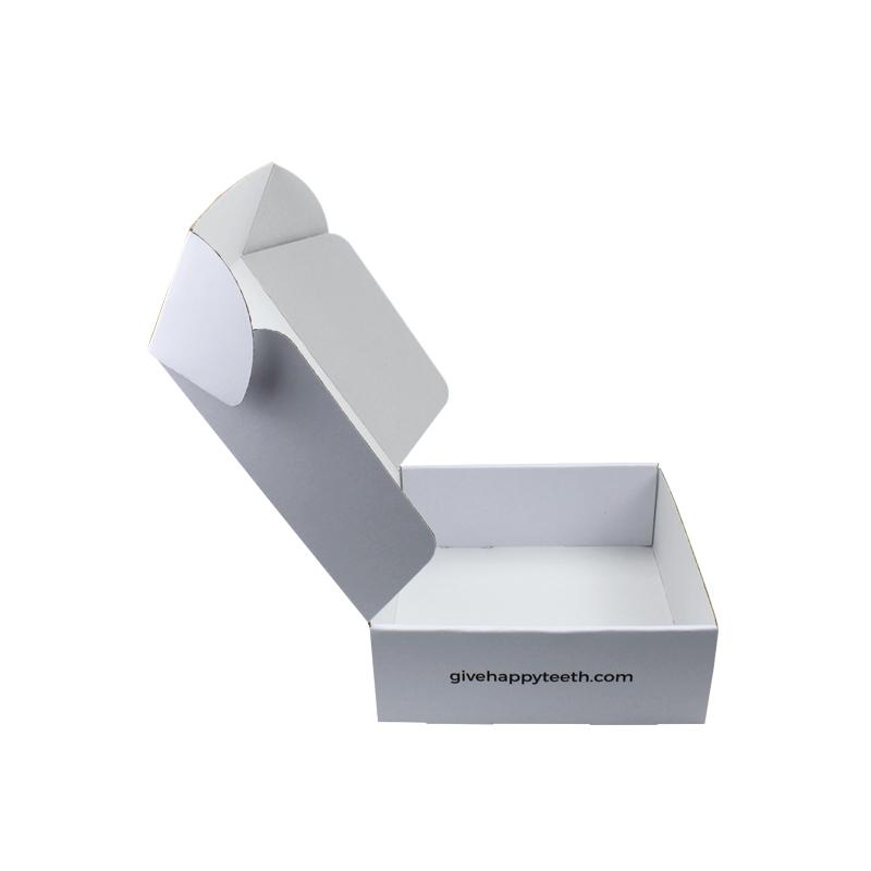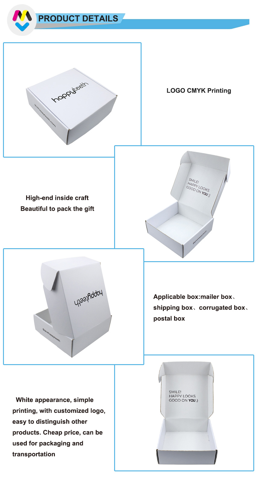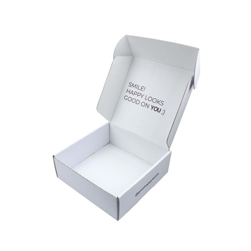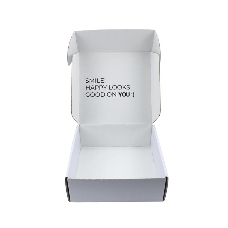 هذا هو اللون الأبيض ص صناديق التعبئة والشحن مع شعار مطبوع على كلا الجانبين. شعار أسود بسيط يوفر تكاليف التغليف.